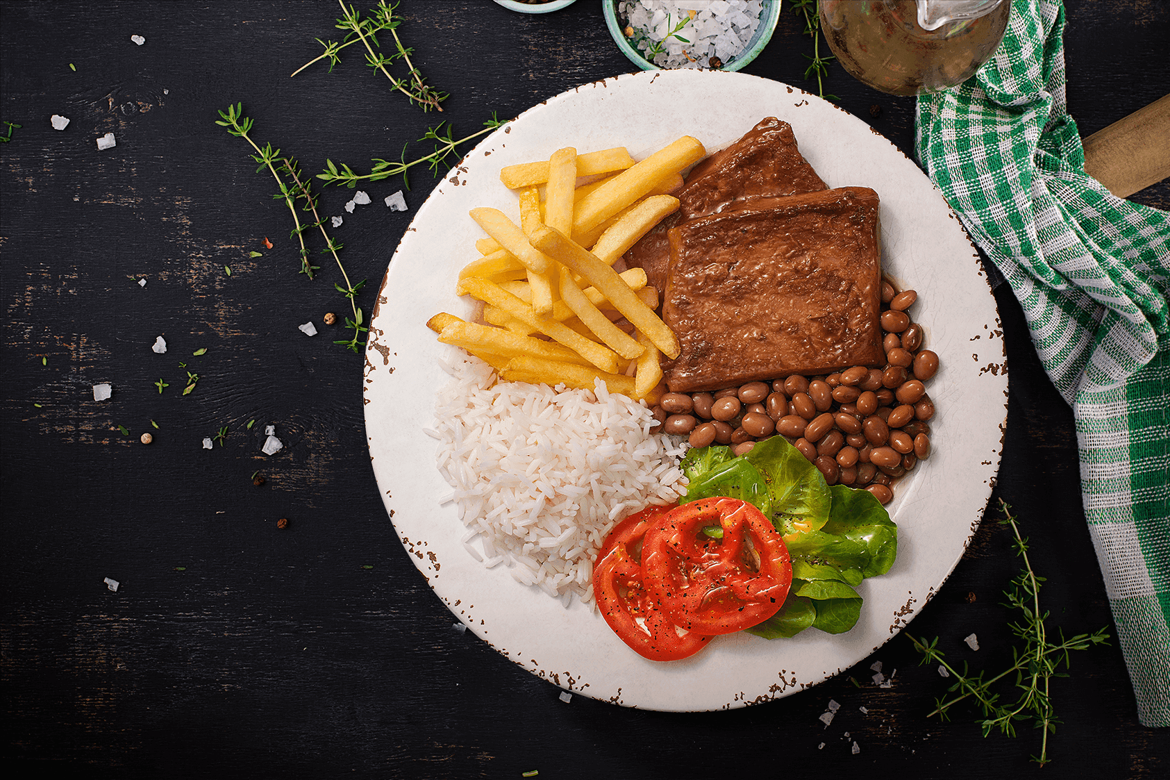 3 - Sirva com o arroz, feijão, batata frita e a salada, tempere com sal e azeite.